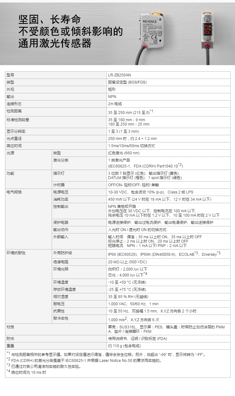 日本KEYENCE基恩士光電傳感器LR-ZB250AN 放大器內置型CMOS激光傳感器 LR-Z系列: 同級別中的檢測能力 堅固&長壽命,對油、酸和堿性清潔劑高度耐受,可在惡劣環境下使用 簡化操作 應用廣泛